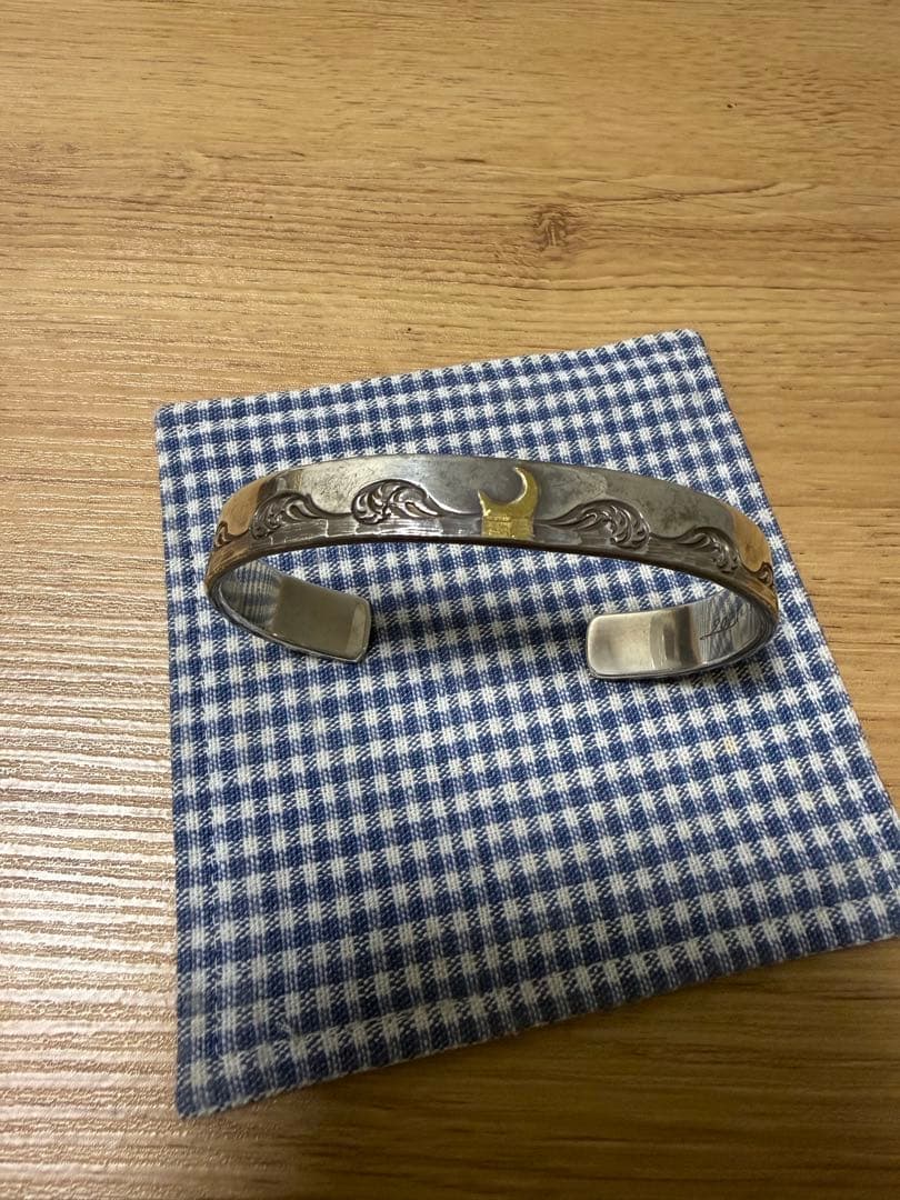 ご覧いただきありがとうございます。こちらのサイトで新品で購入してから付けずに飾っていました。重みもあり、革ブレスと重ね付けするとかっこいいです。薄さやクオリティーが良く肌あたりが完璧です。 シルバー925サイズ M最後あたりは参考画像です。ハンドメイド ノーブランド インディアンジュエリー です。デニム、アメカジ、ゴローズ、タディアンドキング との相性は抜群です。返品交換などは致しません。ご理解頂ける方のみお取引よろしくお願いいたします。