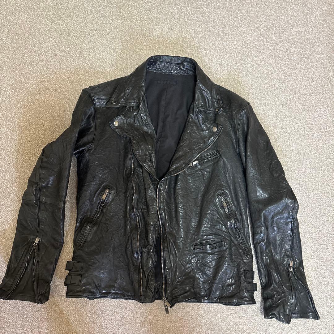 25日迄の限定お値下げです。ジッパーポケット付きのレザーライダースジャケット。- 色:ダークネイビ- デザイン: ジッパーポケット付き- スタイル: ライダースジャケット- 素材:ラム レザー- 襟のスタイル: スタンドカラー義兄からの出品物です。愛用していたそうですが太ってしまい出品になりました。とても良いカラーです。しまってありシワがあります。ネットでシワの取り方を見て下さい。ある程度着用すれば取れてくるかも知れませんが…。これも味があるかもです。首元のファーがありません。左肩に引っ掛けキズがあったので直しに出したそうです。15枚目の丸の部分肩下です。ファー、キズ 、シワをご了解頂けましたら宜しくお願い致します。少しお安く出品致します。その他は問題点ありません。お買い得ですよ〜。着丈…62脇下身幅…52袖丈…63立ち襟部分…8肩幅…45
